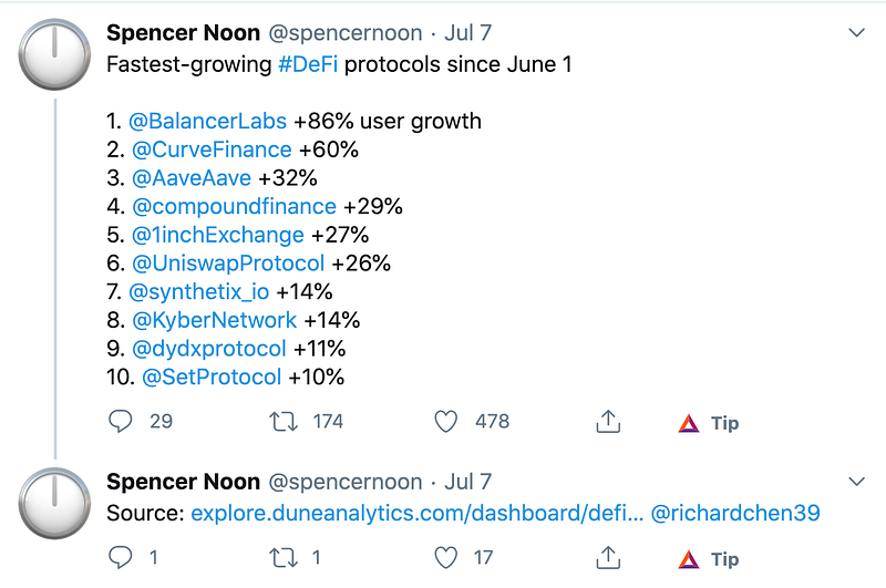 By now, 1inch’s trading volumes have reached $700 million. The constantly rising number of users brought 1inch to the fifth place among the fastest-growing protocols, according to Spencer Noon’s ranking.