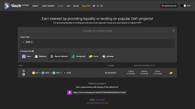 The Curve sUSD pool will be available on 1inch as a native tool, so users don’t have to go first to Curve’s website and then to that of Synthetix. All operations such as providing liquidity to Curve and staking sUSD on Synthetix can be done within 1inch.exchange unified user-friendly interface.