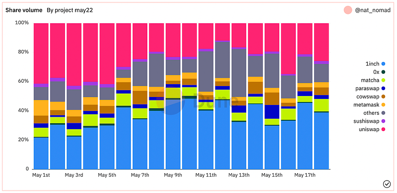 Overall, on May 12, 1inch’s market share among dApp users reached 23.1% among all DEXes, while that of Uniswap declined to 5.8%.