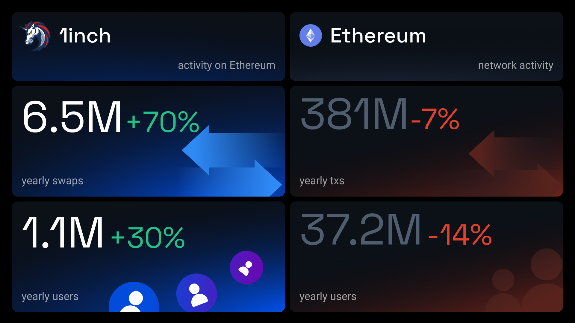 However, 1inch’s stats on Ethereum were quite the opposite. The number of swaps increased by 70% to 6.5 mln, corresponding to $83 bln in volume, while the user base grew by 30% to reach 1.1 mln.