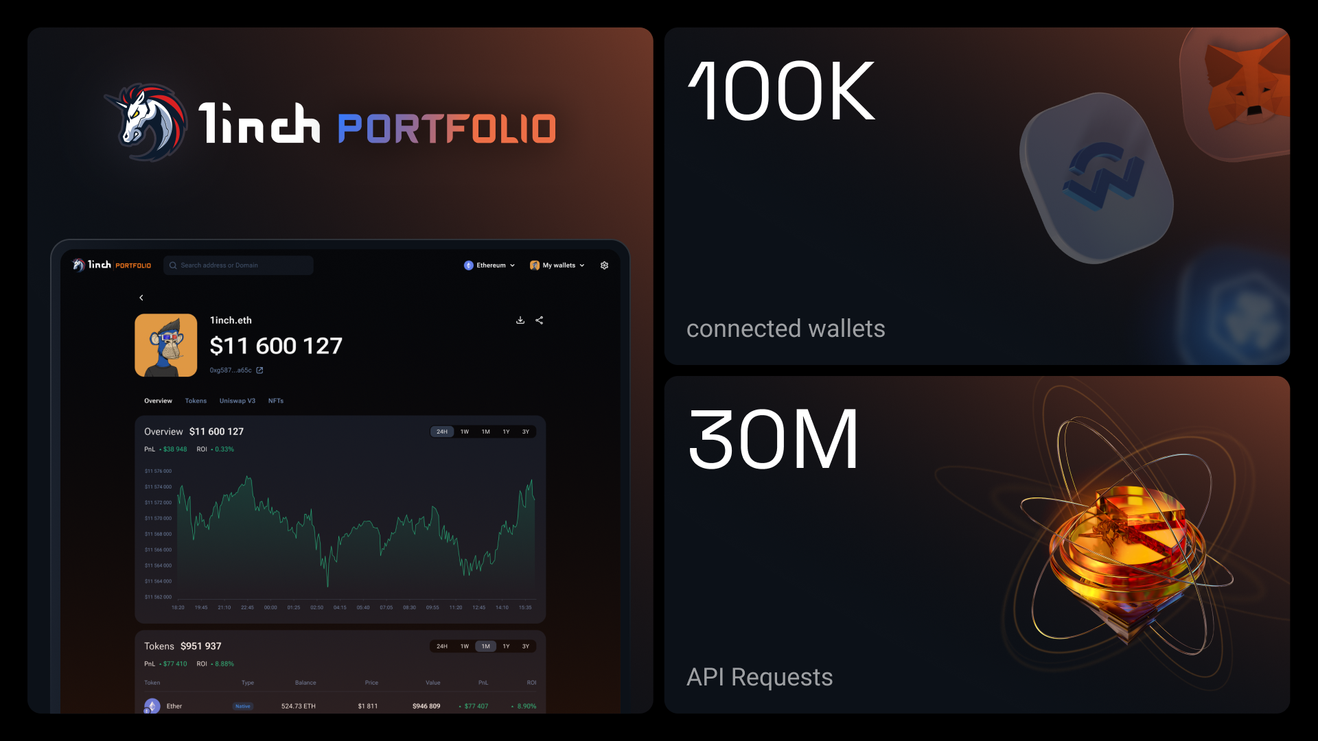 Last year, we also launched the 1inch Portfolio, an innovative tool that allows you to manage assets in multiple wallets across all chains. In the first six weeks following the release, over 100,000 wallet addresses used the tool, while the number of requests of the 1inch Portfolio API exceeded 30 mln.