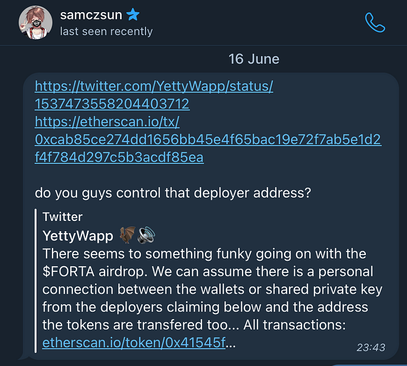 In June 2022, a 1inch contributor received a strange message from @samczsun regarding suspicious activity of one of the 1inch deployer wallets, as well as Synthetix’ and some others: