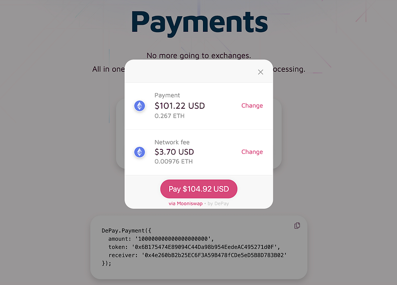 DePay is an, anything to anything, crypto payment conversion. This game-changer of hack is a widget that you initialize just by calling a small piece of Javascript. It then guides the user through a state-of-the art payment process. No more sending users to exchanges. DePay tries to convert anything the user has stored in his or her wallet to pay the dApp.