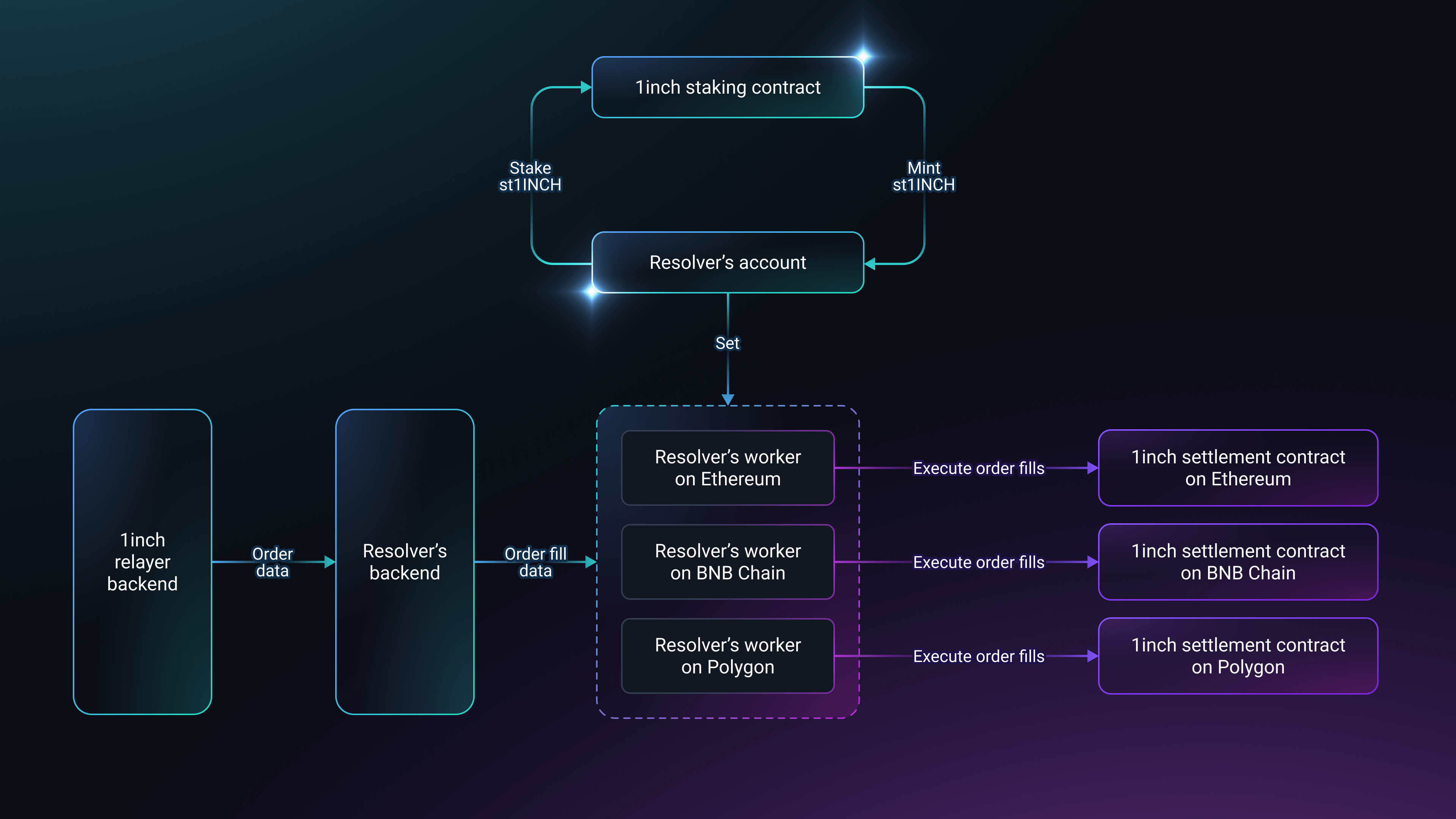 | A resolver’s workers | Smart contracts or just wallets (externally owned accounts, EOA) associated with the resolver’s account for each of the supported networks (as of early March, Ethereum, BNB Chain and Polygon are supported). A resolver can have 1 worker per chain, or between 1 and 3 workers in total. |