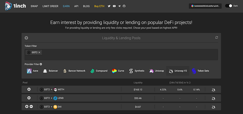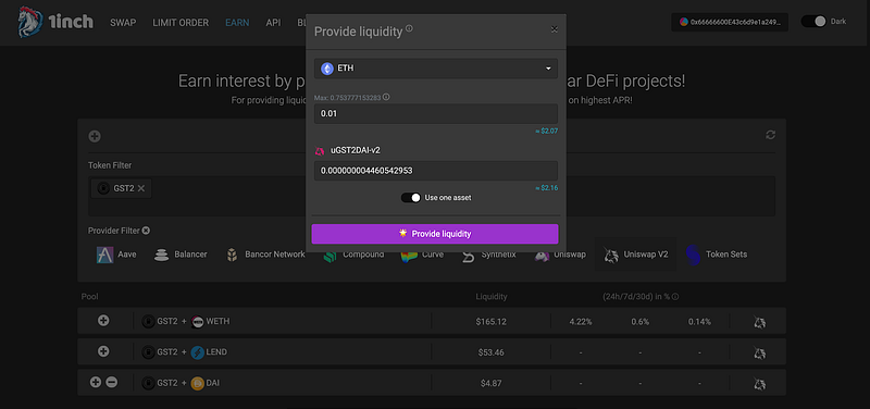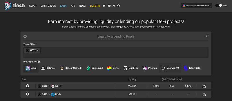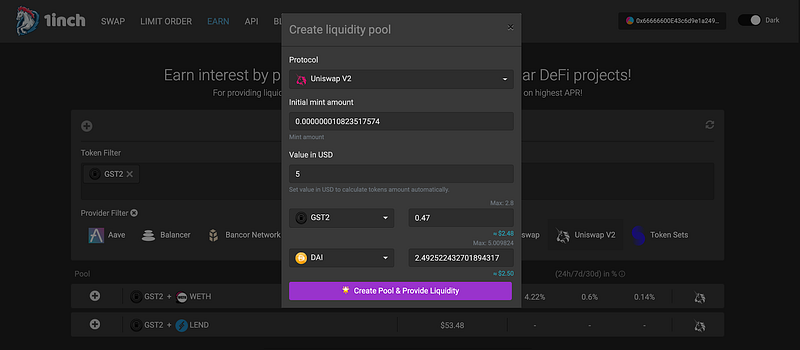 Here we are! The GST2<>DAI Pool has been created. Now you can provide more liquidity (or withdraw existing liquidity) by clicking the plus (minus) button.