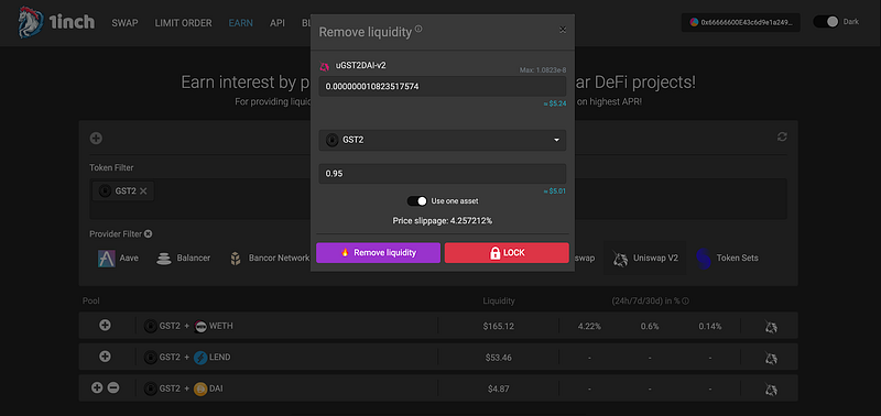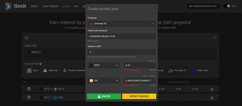 Choose the underlying pool assets (for example, GST2 and DAI, as in the screenshot). To create a pool and provide liquidity in one transaction, you need to unlock the sub tokens. Click on the Unlock button to allow the UniswapV2 Router smart contract to make transactions with the selected amount of assets. You can also provide the infinity unlock by clicking the Infinity Unlock button.