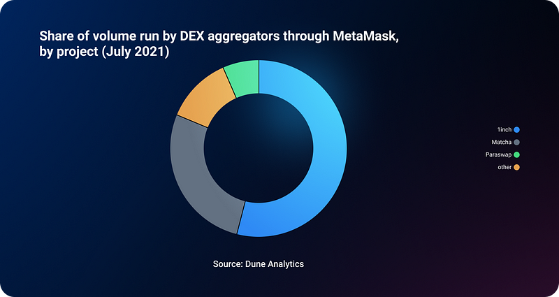MetaMask, the most popular wallet in the Ethereum ecosystem, occupies a unique position in the DEX segment, as it has a built-in aggregator for liquidity from other aggregators, including 1inch, ParaSwap and Matcha. Basically, MetaMask acts as an ‘aggregator of aggregators’.