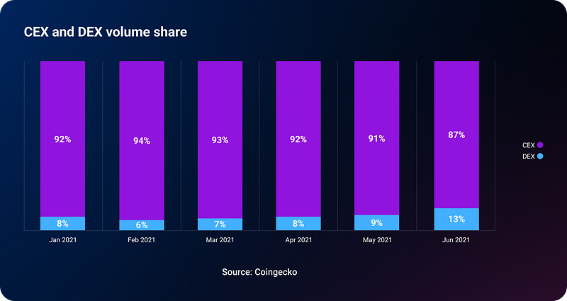 However, despite the market correction period in the second quarter of 2021, DEXes have been successfully luring business away from centralized exchanges. Between January and June, while DEXes’ total trading doubled, the CEX segment saw much more modest growth from $1.2 trillion to $1.3 trillion.