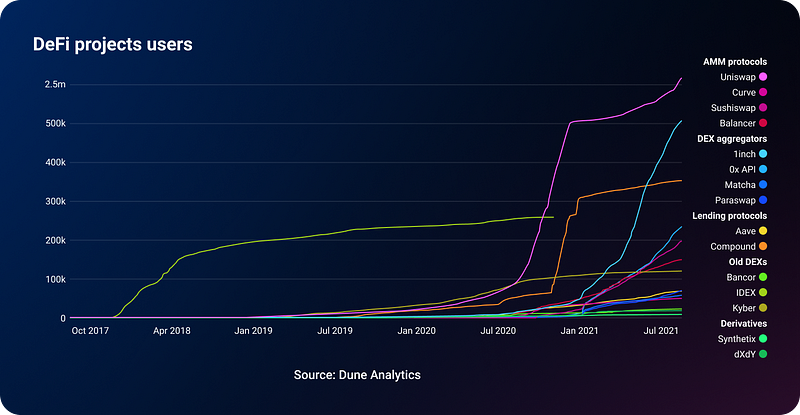 The only category of DeFi projects that has shown robust growth is AMM-based DEXes and DEX aggregators, such as 1inch, Uniswap, SushiSwap and 0x.