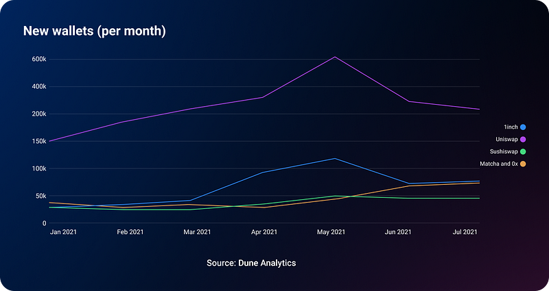 The number of new wallets has been falling since May for all projects, except for Matcha. However, for Uniswap, the decline in new wallets has been more significant than for other projects.