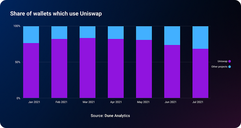 The share of wallets which use Uniswap has been shrinking, while the share of wallets which use other projects has been rising.