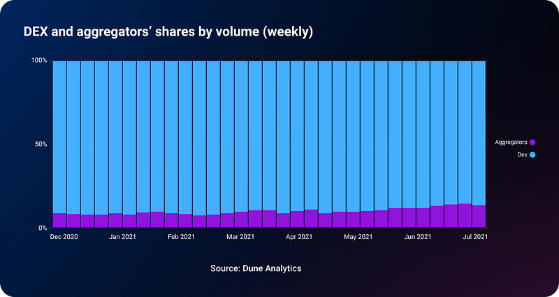 As a result, since the beginning of 2021, the share of DEX aggregators volume has doubled from 7.5% to 15%.