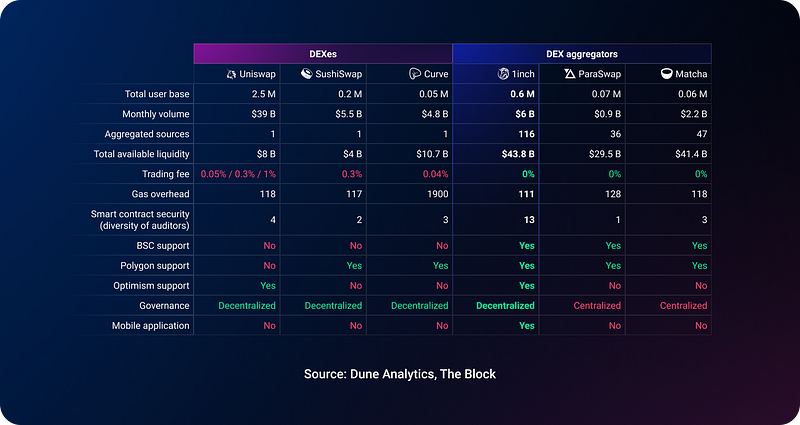 DEX aggregators, such as 1inch and Matcha, have been able to offer users better swap rates than they would get by swapping directly on Uniswap, SushiSwap and other DEXes. Therefore, users have been increasingly opting for DEX aggregators, boosting their market share.