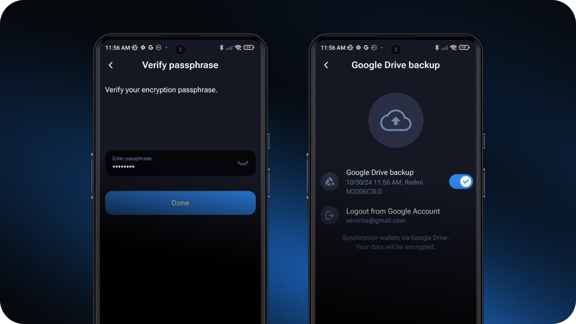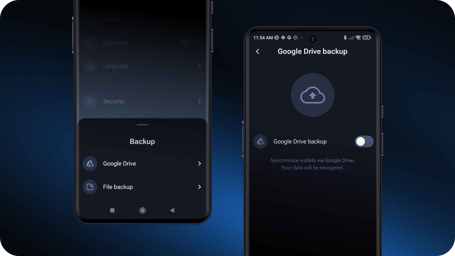 Cloud backup: securely stores key wallet data, such as private keys and recovery phrases, in the cloud, ensuring easy restoration of access to funds on a new device.