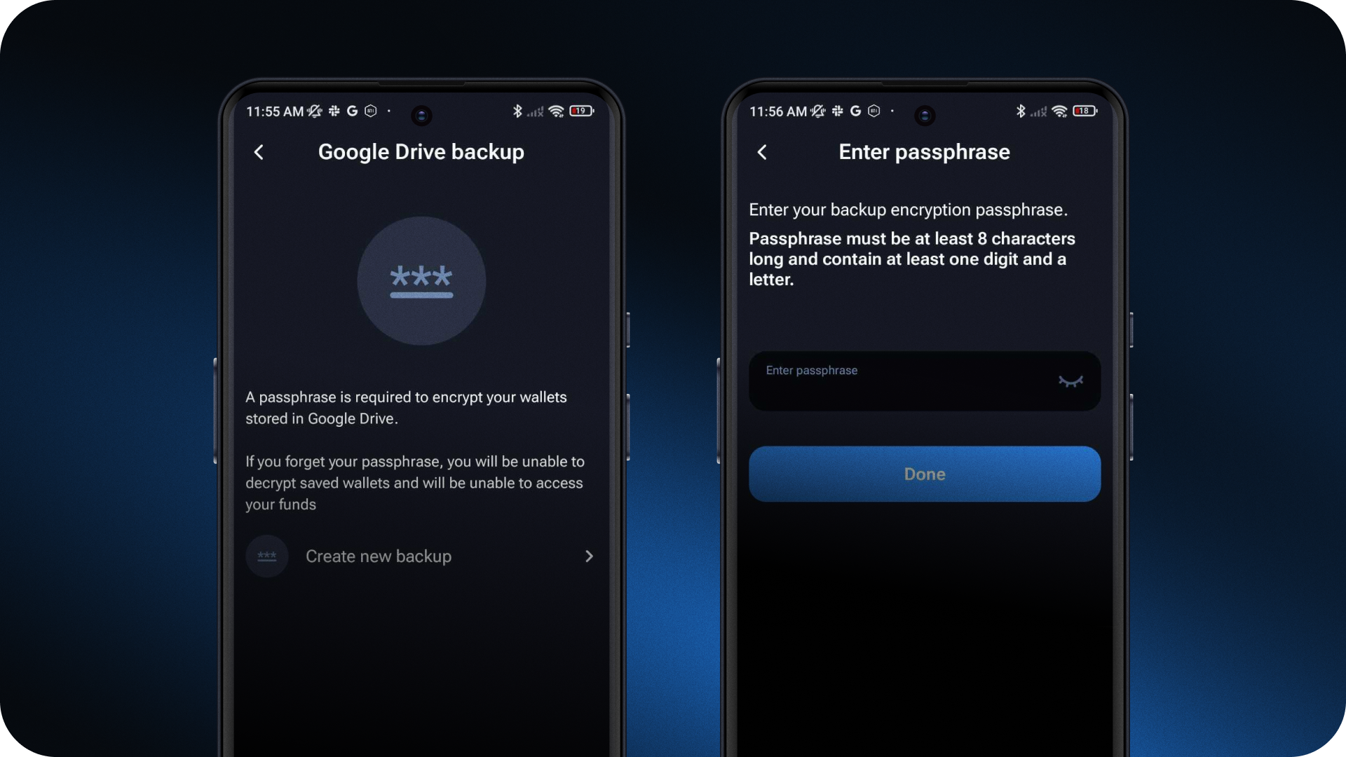 - Set up a Google Drive encryption passphrase for added security, and verify it.
