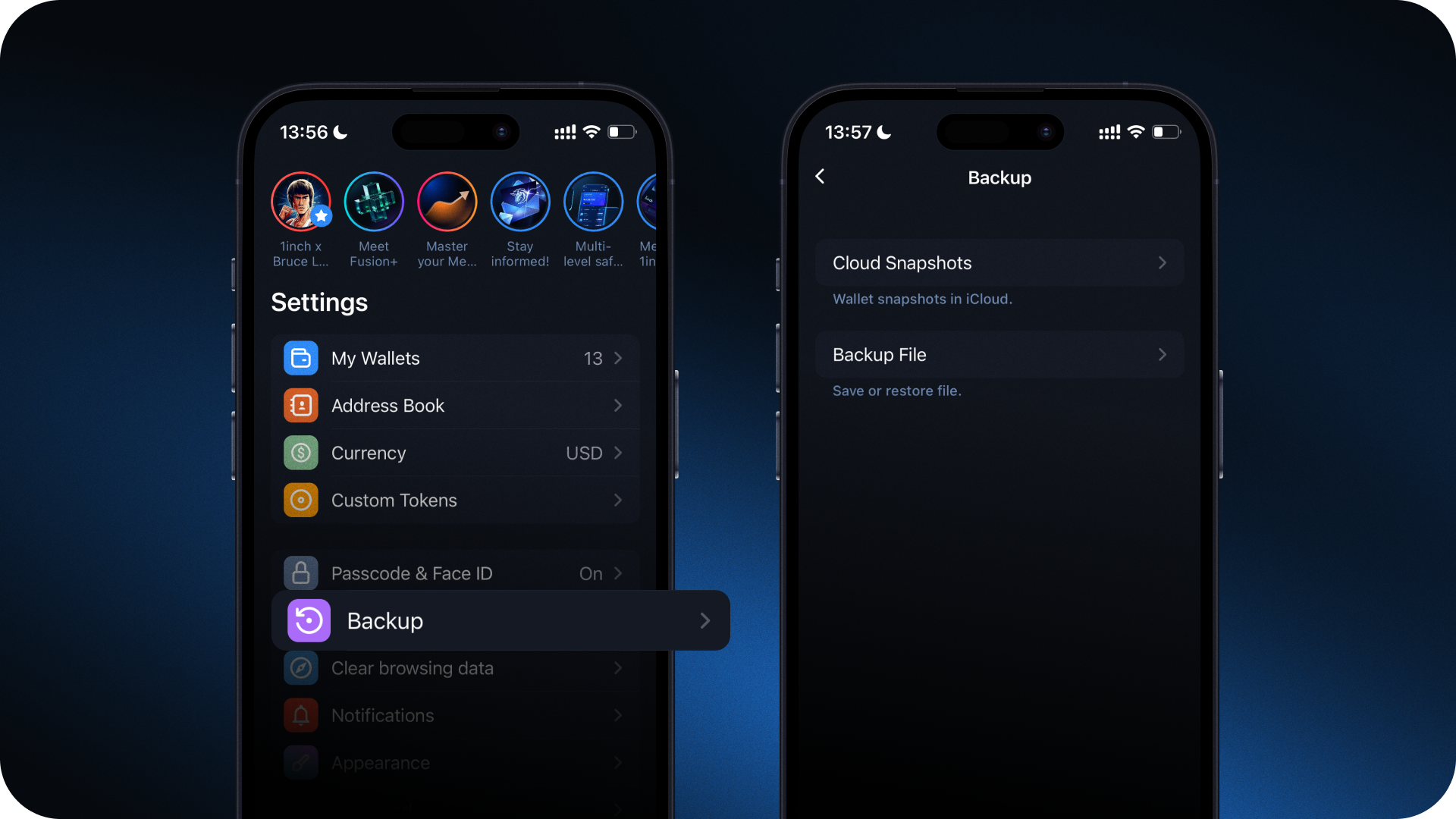 With the 1inch Wallet, data and key wallet activities are secured by advanced backup and snapshot capabilities, giving users confidence to explore Web3.