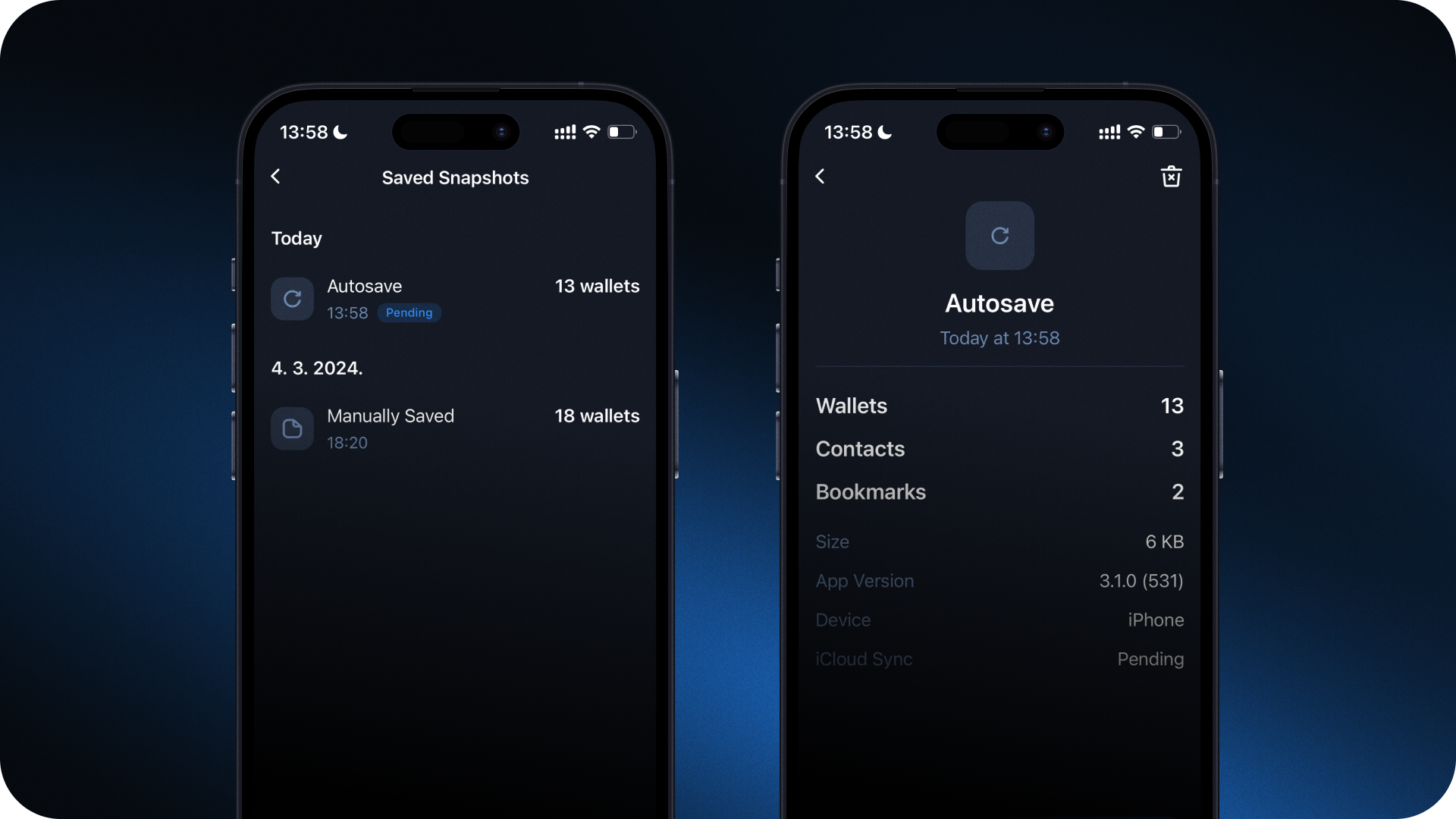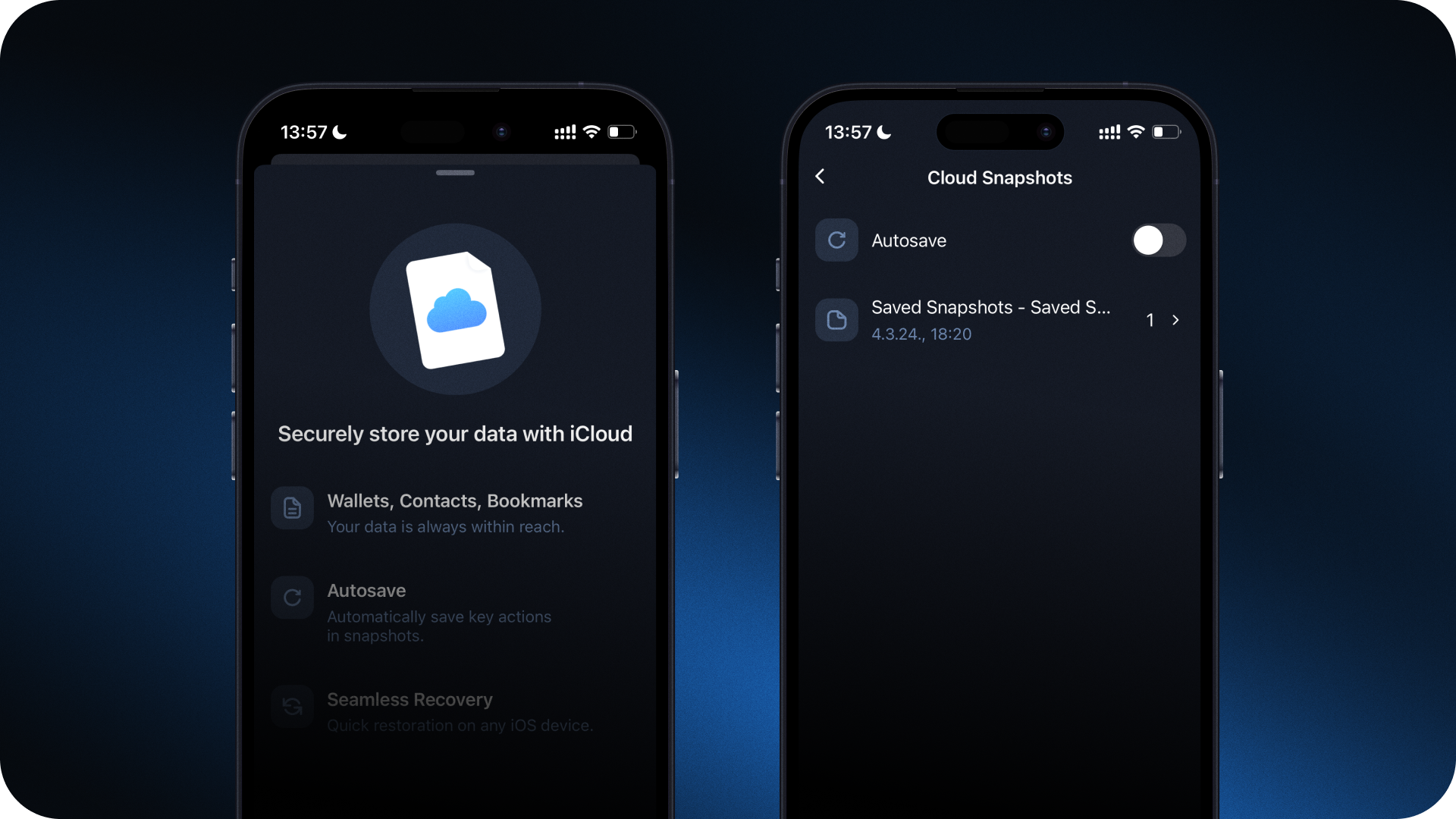 - Tap on Cloud Snapshots and enable Autosave to automatically capture changes in imported wallets, contacts and bookmarks.